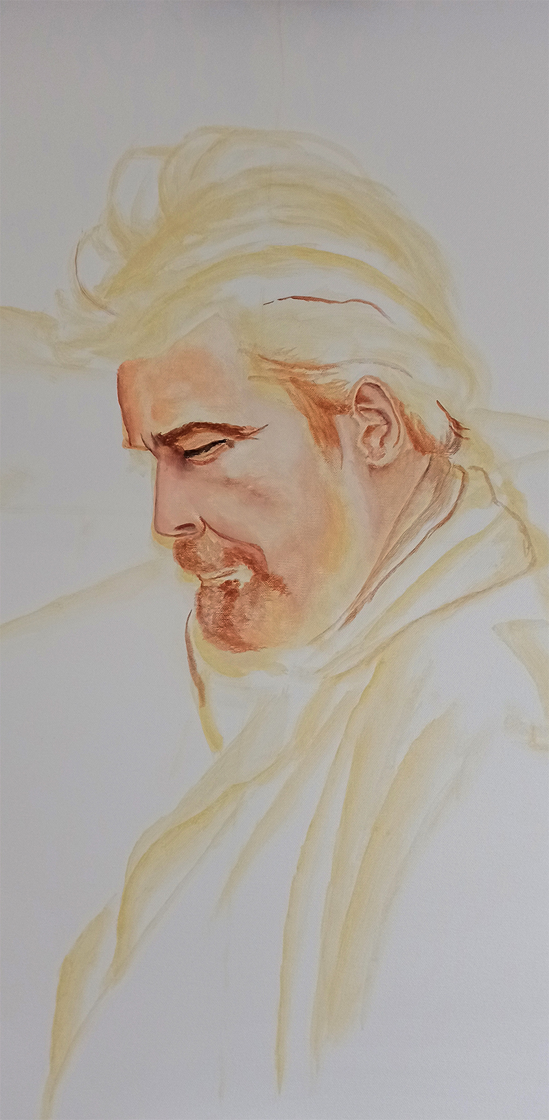 Van schets, naar Imprimatura, naar 'dood verven', naar olieverf), nu mee bezig.